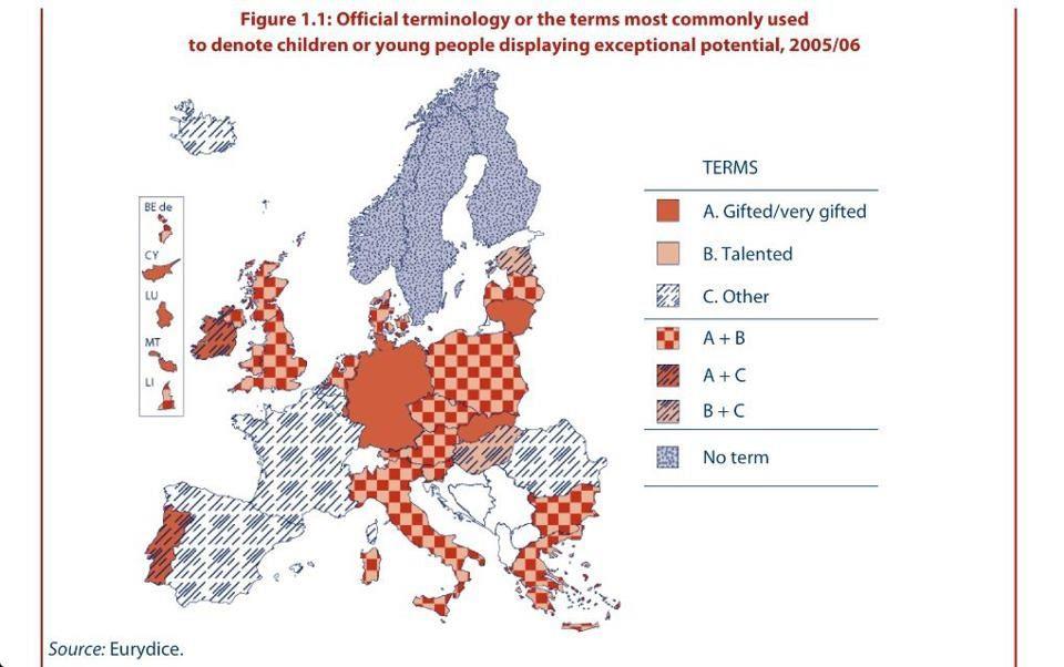 Under ser du et utsnitt fra Eurydice sin rapport fra 2006 «Specific educational measures to promote all forms of giftedness at school in Europe.» Figuren viser hvilke land i Europa som har offisiell terminologi for å betegne barn med høyt potensiale. (Siden rapporten er noen år gammel har den ikke fått med de seneste endringene i Finland, der man nå har utarbeidet både planer og videreutdanning for lærere om evnerike barn.)